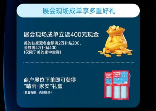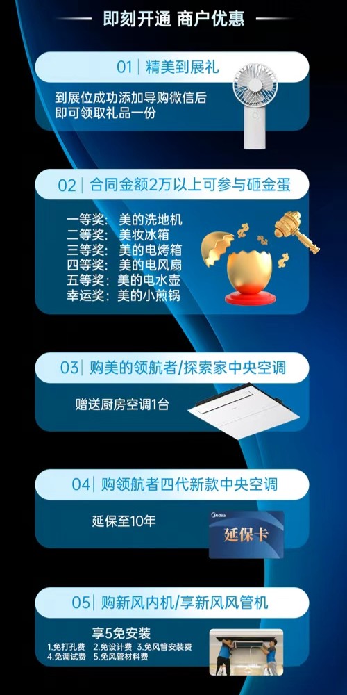 1. 展会现场成单享多重好礼:成单立返400元现金,且下单即可获得“晴雨·家安”礼盒; 2. 精美到展礼:到展位成功添加导购微信后即可领取礼品一份 3. 合同金额2万以上可参与砸金蛋 4. 购美的领航者/探索家中央空调,赠送厨房空调1台 5. 购领航者四代新款中央空调,延保至10年 6. 购新风内机/享新风风管机,享5免安装